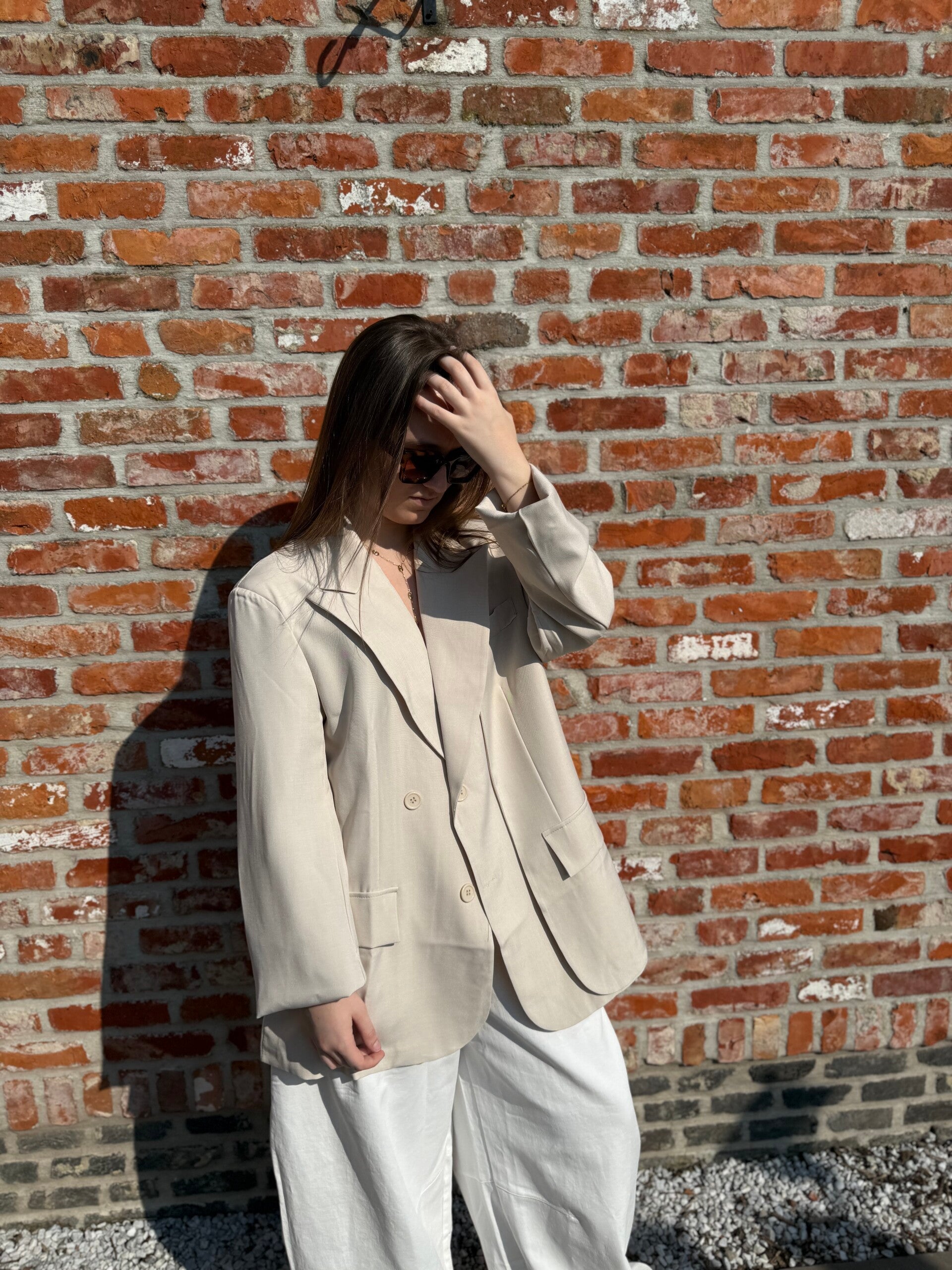 Blazer with long sleeves and shoulder pads, featuring faux pockets and a double-breasted design with front buttons and a lapel collar